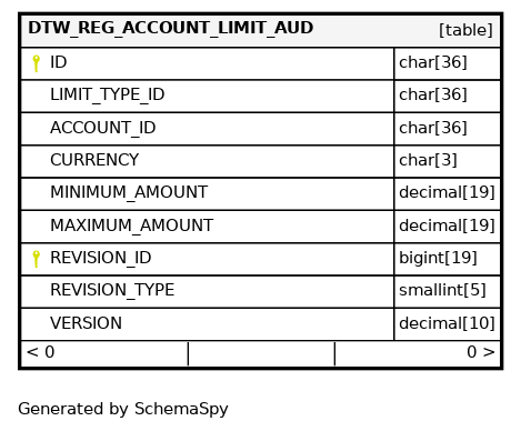 | DTW_REG_ACC_LIMIT_AUD_NID_IDX | Must be unique | Asc/Asc/Asc | REVISION_ID + ACCOUNT_ID + LIMIT_TYPE_ID |