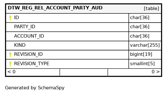 | DTW_REG_ACC_PARTY_AUD_NID_IDX | Must be unique | Asc/Asc/Asc | REVISION_ID + ACCOUNT_ID + PARTY_ID |